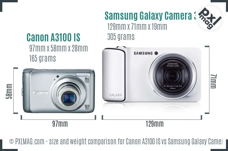 When you are going to carry your camera often, you will want to consider its weight and measurements. The Canon A3100 IS enjoys physical measurements of 97mm x 58mm x 28mm (3.8" x 2.3" x 1.1") with a weight of 165 grams (0.36 lbs) and the Samsung Galaxy Camera 3G has proportions of 129mm x 71mm x 19mm (5.1" x 2.8" x 0.7") and a weight of 305 grams (0.67 lbs).