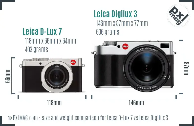 In case you're aiming to carry around your camera, you have to consider its weight and measurements. The Leica D-Lux 7 features outer dimensions of 118mm x 66mm x 64mm (4.6" x 2.6" x 2.5") having a weight of 403 grams (0.89 lbs) while the Leica Digilux 3 has proportions of 146mm x 87mm x 77mm (5.7" x 3.4" x 3.0") and a weight of 606 grams (1.34 lbs).