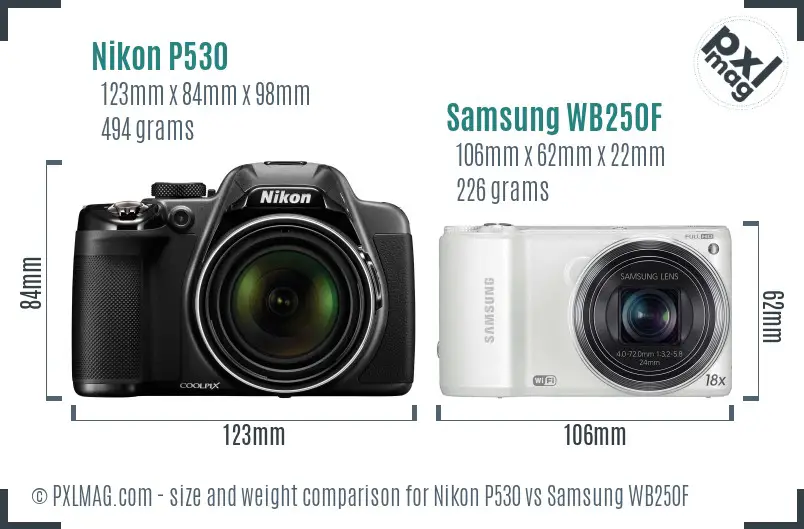 The Nikon P530 is an SLR-style bridge camera, larger and chunkier compared to Samsung’s petite WB250F. Its dimensions of 123x84x98 mm and weight of 494 grams give it a commanding grip that’s a boon for steady shots, especially at extreme zoom levels. The pronounced handgrip and textured surface invoke confidence - something I appreciated during longer outdoor sessions where I found my hands less cramped or fatigued.