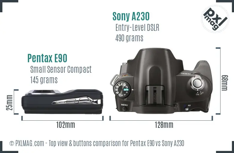 For anybody who is aiming to carry your camera, you're going to have to factor its weight and dimensions. The Pentax E90 enjoys physical dimensions of 102mm x 59mm x 25mm (4.0" x 2.3" x 1.0") having a weight of 145 grams (0.32 lbs) while the Sony A230 has dimensions of 128mm x 97mm x 68mm (5.0" x 3.8" x 2.7") and a weight of 490 grams (1.08 lbs).