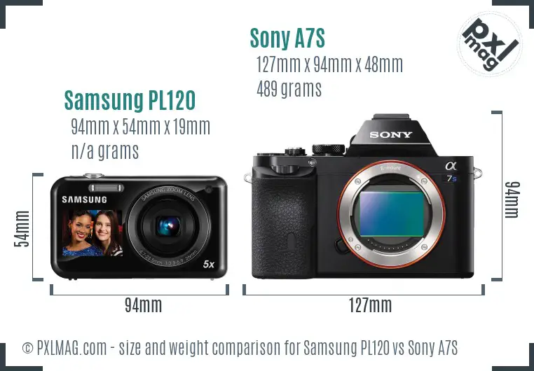 If you're going to carry your camera frequently, you will need to take into account its weight and dimensions. The Samsung PL120 has outside dimensions of 94mm x 54mm x 19mm (3.7" x 2.1" x 0.7") having a weight of n/a grams (0.00 lbs) while the Sony A7S has dimensions of 127mm x 94mm x 48mm (5.0" x 3.7" x 1.9") accompanied by a weight of 489 grams (1.08 lbs).