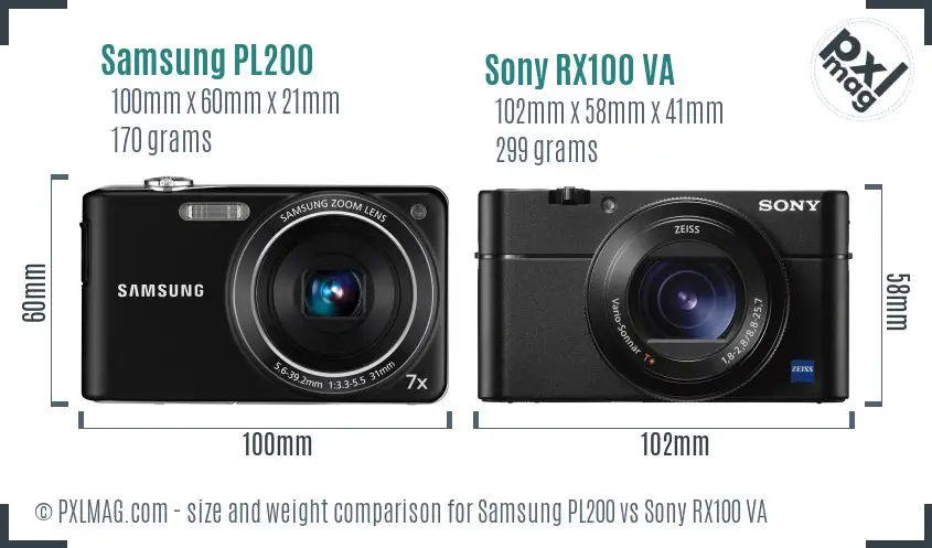 For anybody who is aiming to travel with your camera frequently, you should factor in its weight and dimensions. The Samsung PL200 comes with external measurements of 100mm x 60mm x 21mm (3.9" x 2.4" x 0.8") and a weight of 170 grams (0.37 lbs) and the Sony RX100 VA has dimensions of 102mm x 58mm x 41mm (4.0" x 2.3" x 1.6") having a weight of 299 grams (0.66 lbs).